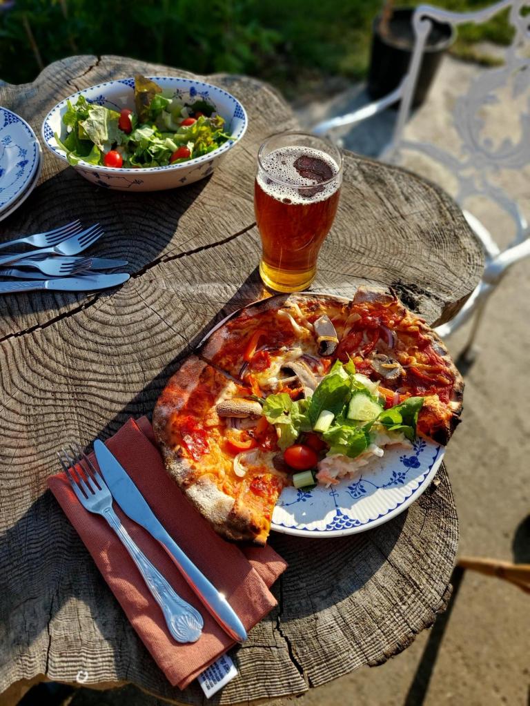 Pizzas are available on weekends unless there is a special occasion. They are priced at £12.50 per person, including a salad sourced from the farm gardens. Let us know if you wish to participate, and fresh pizza and salad will be ready upon your arrival.
