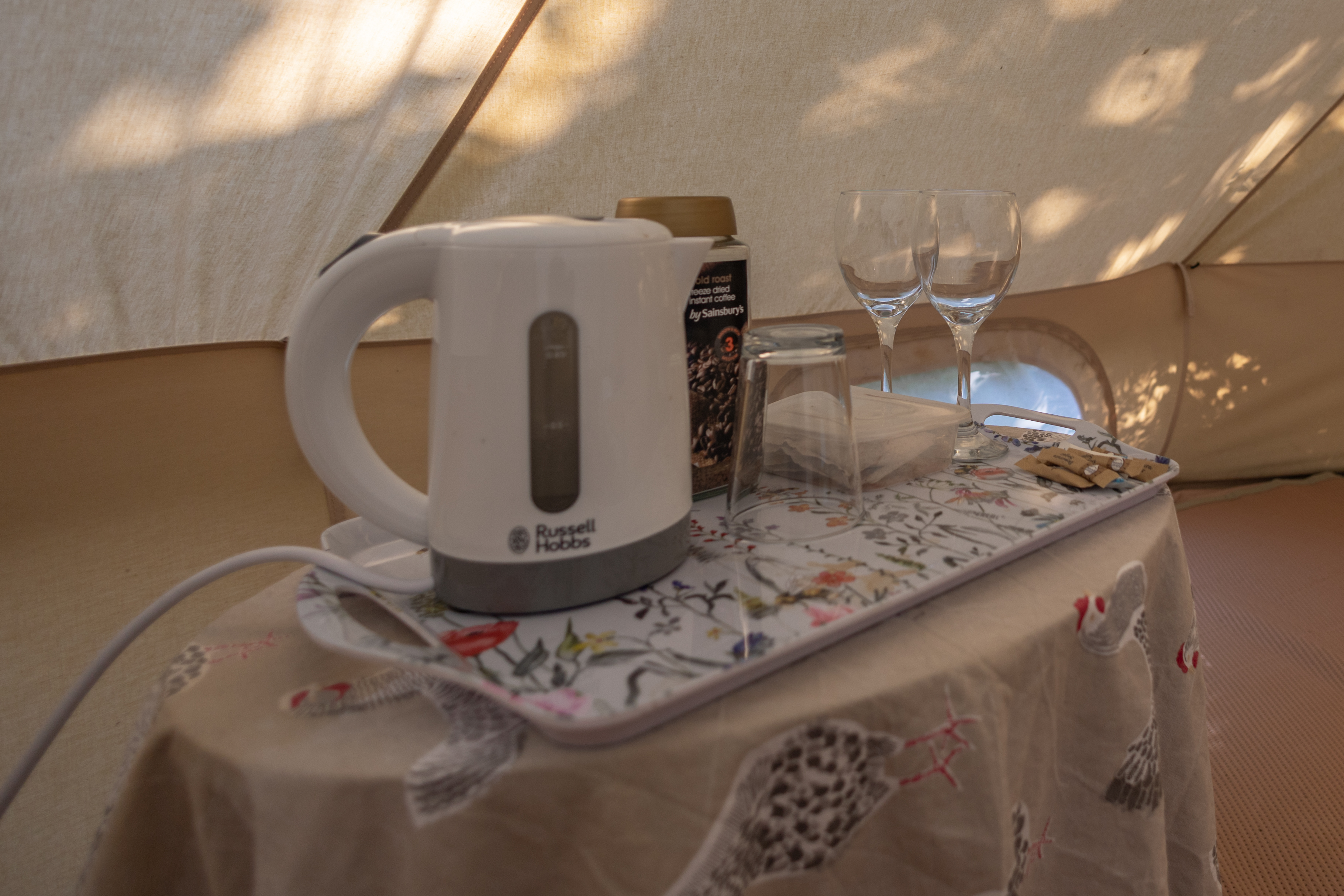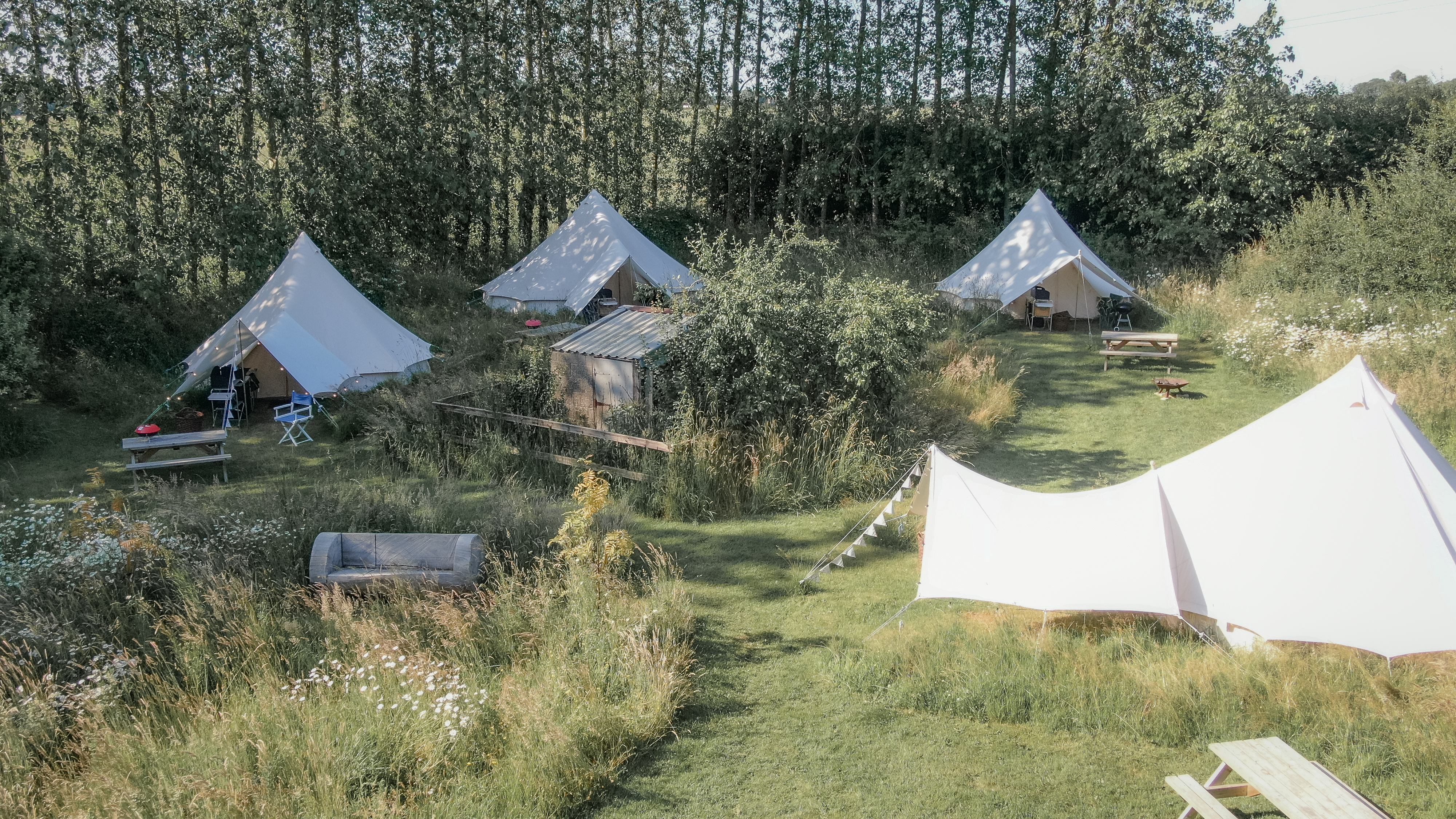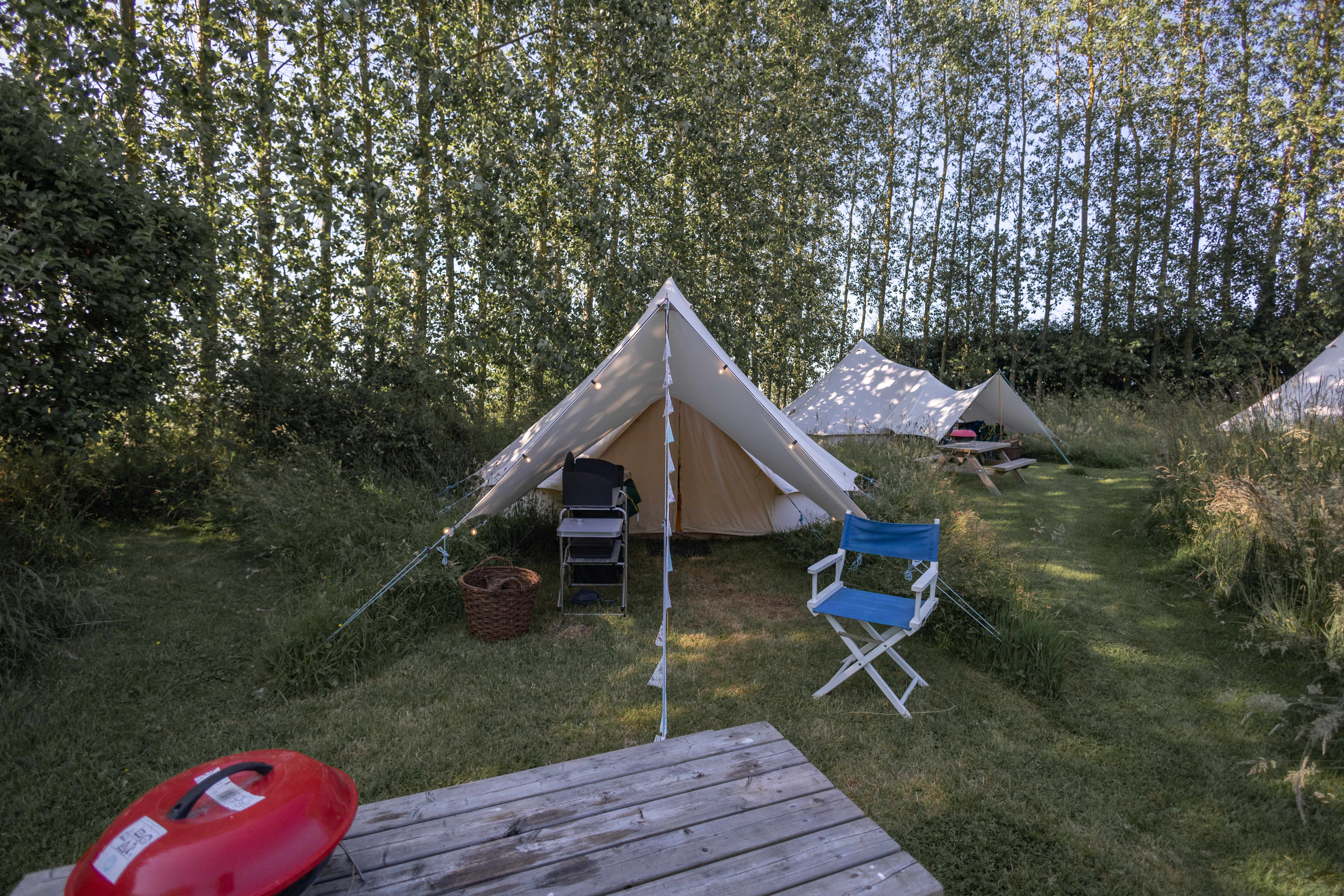 Dogs are not permitted in the bell tents. Guests can enjoy the natural surroundings with the added convenience of power sockets and provided towels.