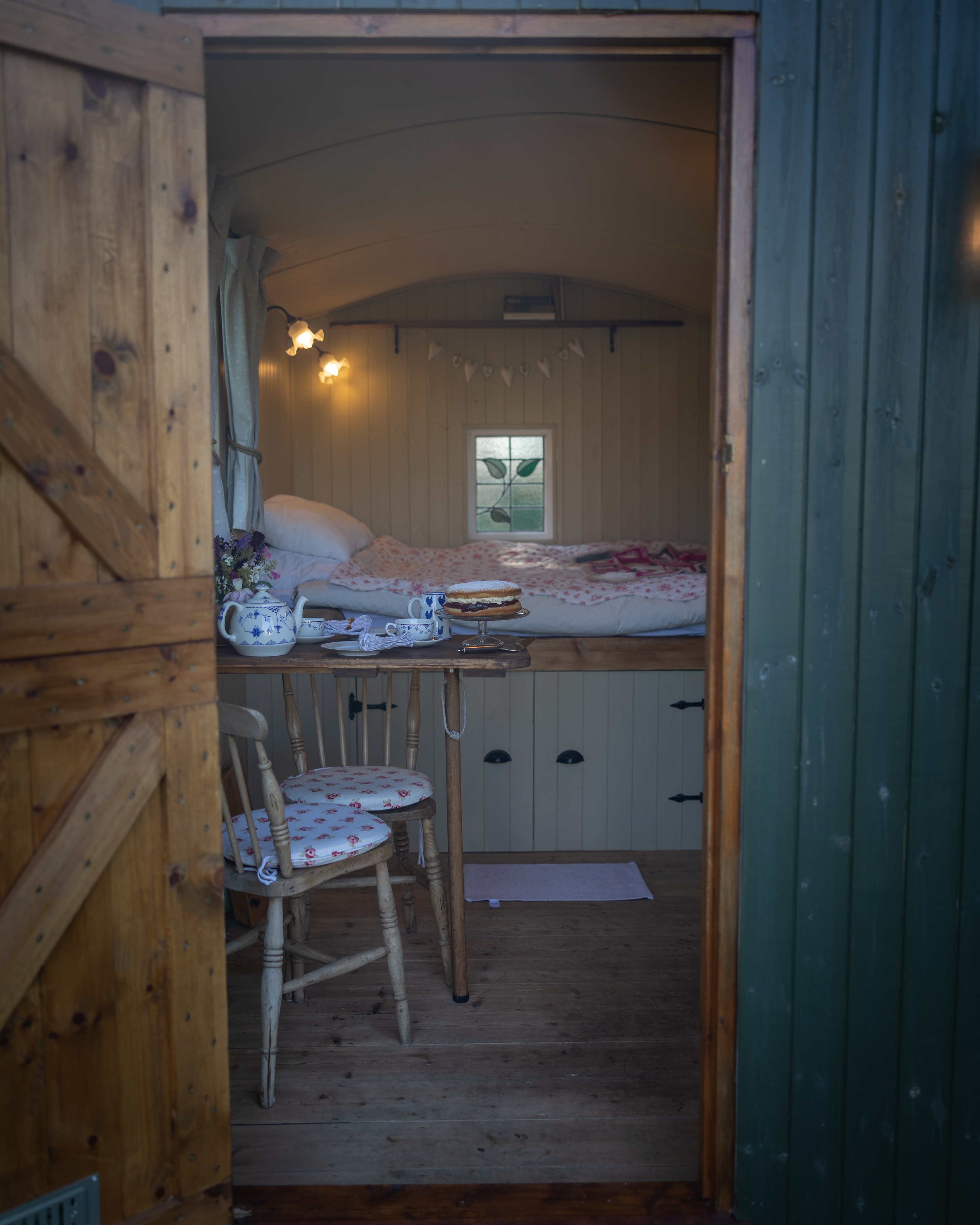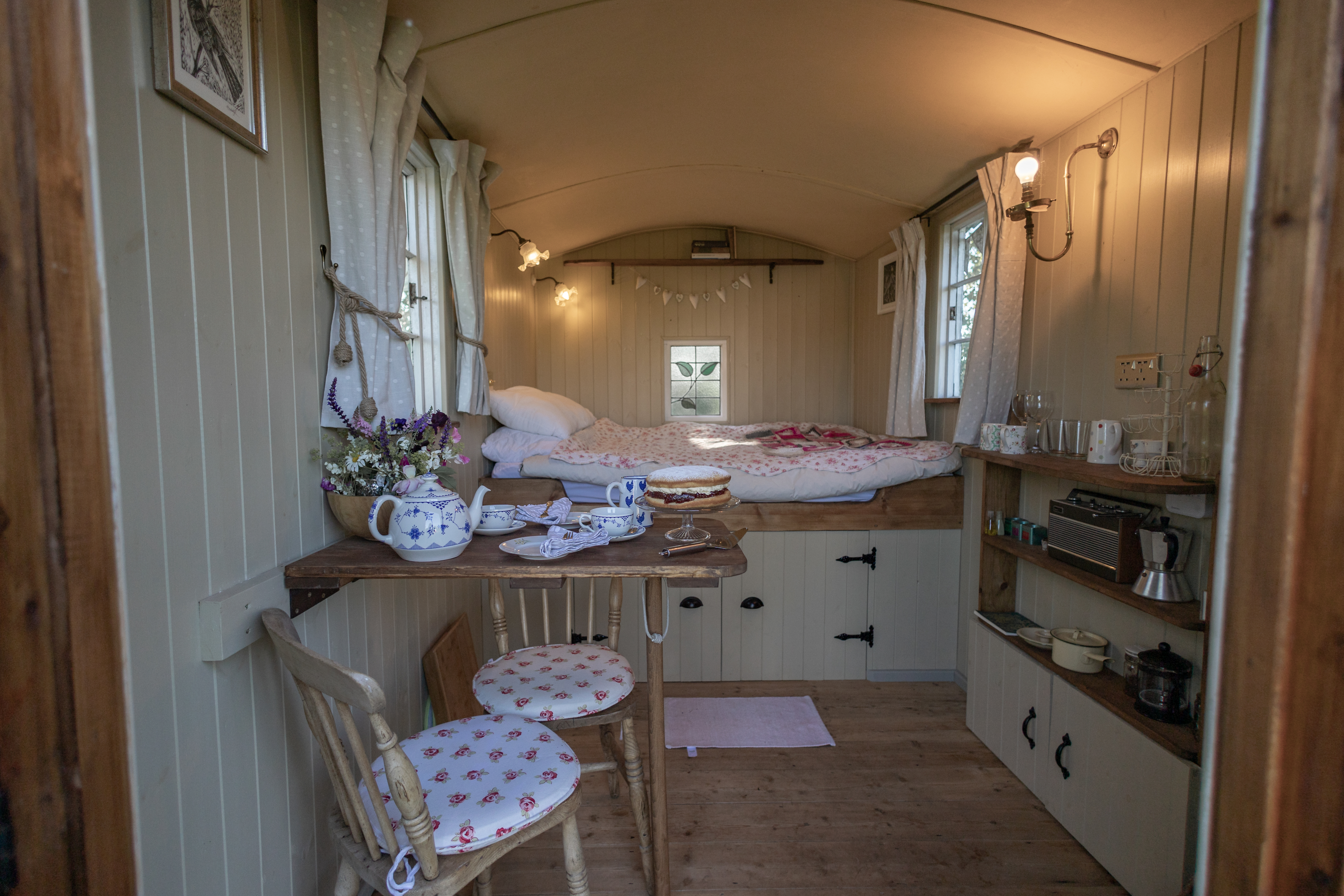 Enjoy a rustic yet modern Shepherd’s Hut, designed for a comfortable stay. Perfect for two adults, the hut features a double bed with bedding and linen included, ensuring a warm and inviting atmosphere.