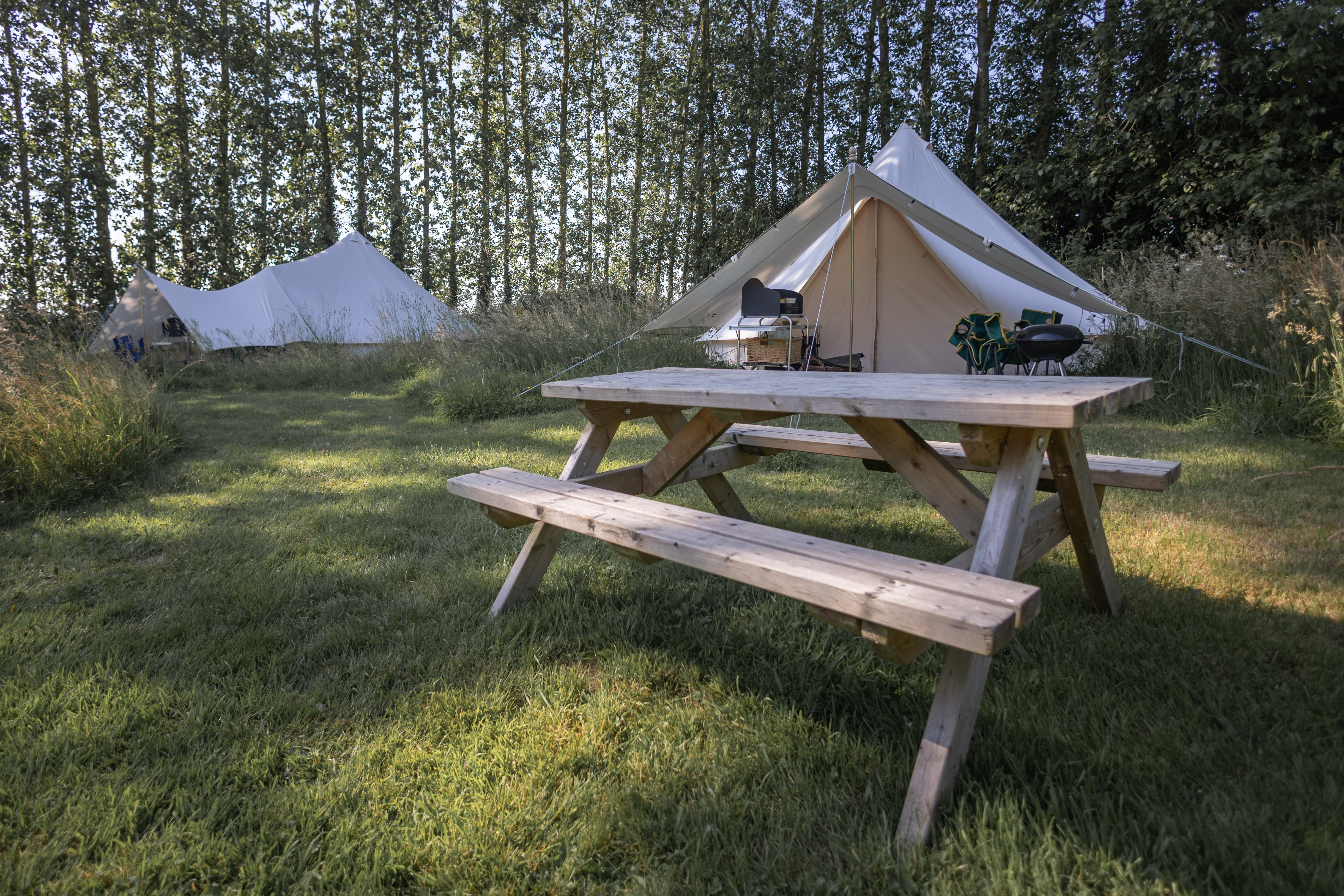 Each tent is equipped with a cool box, barbecue, cooking equipment, a kettle, and a picnic table, making outdoor dining effortless. A campers’ kitchen is available for shared use, providing a convenient space for meal prep.