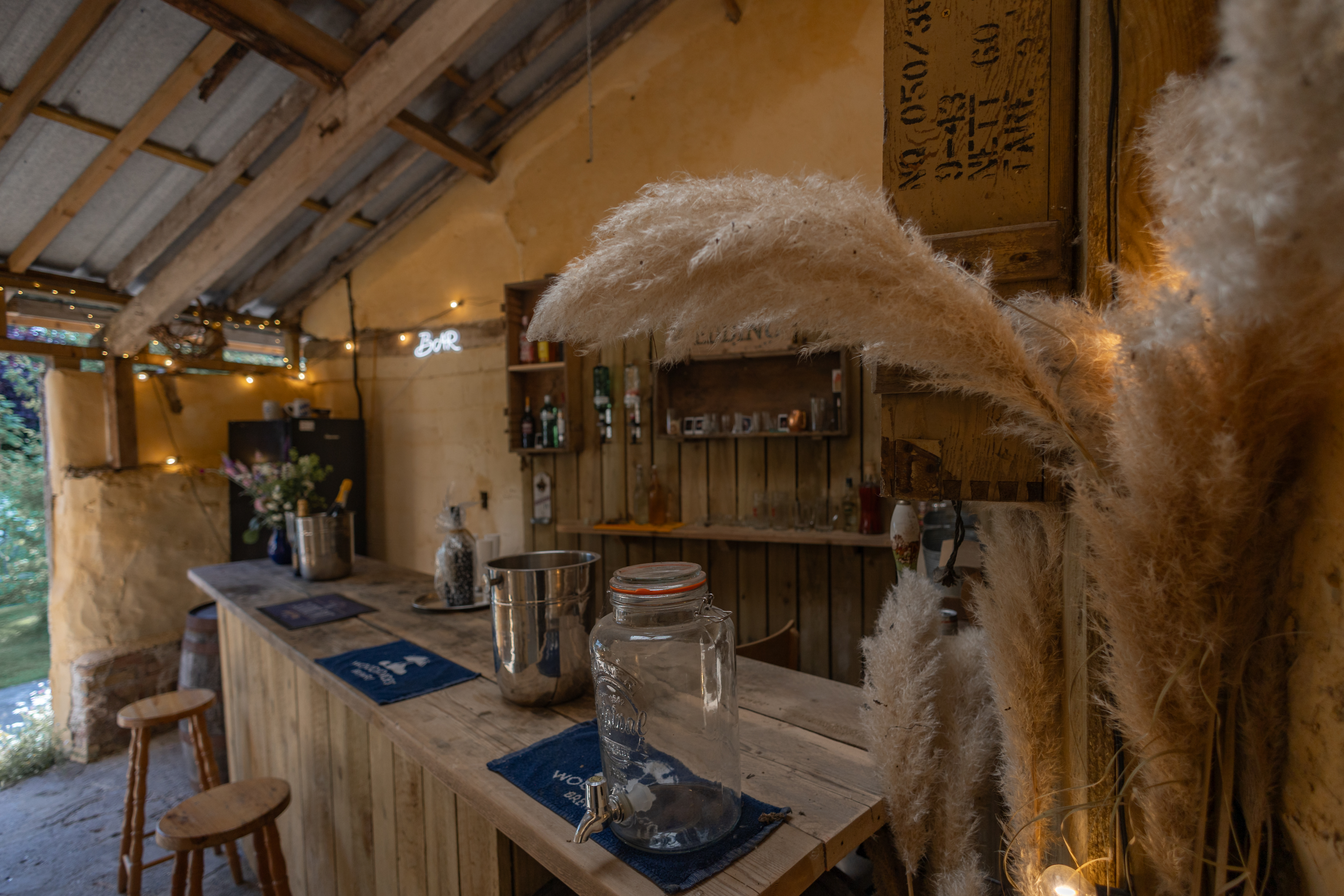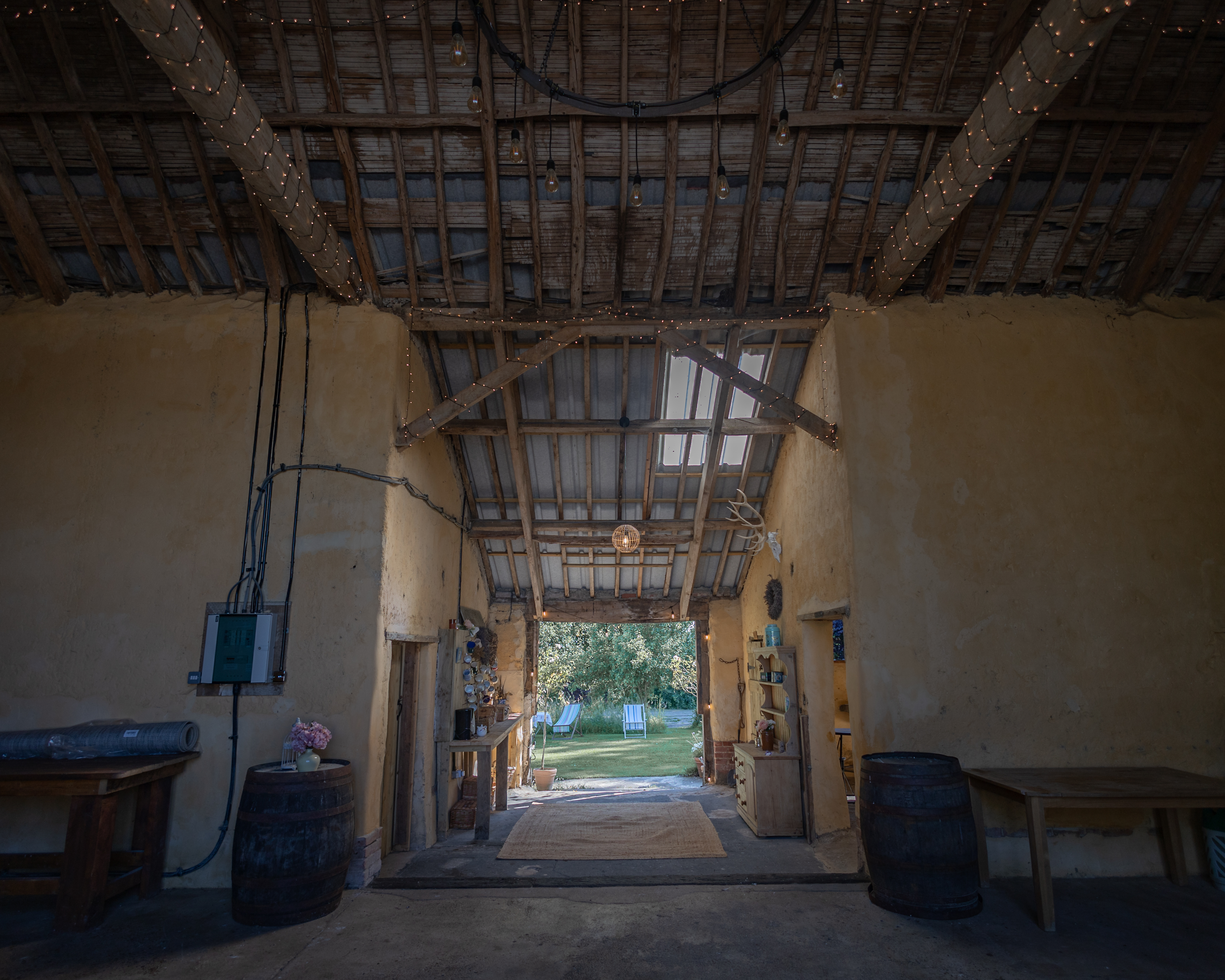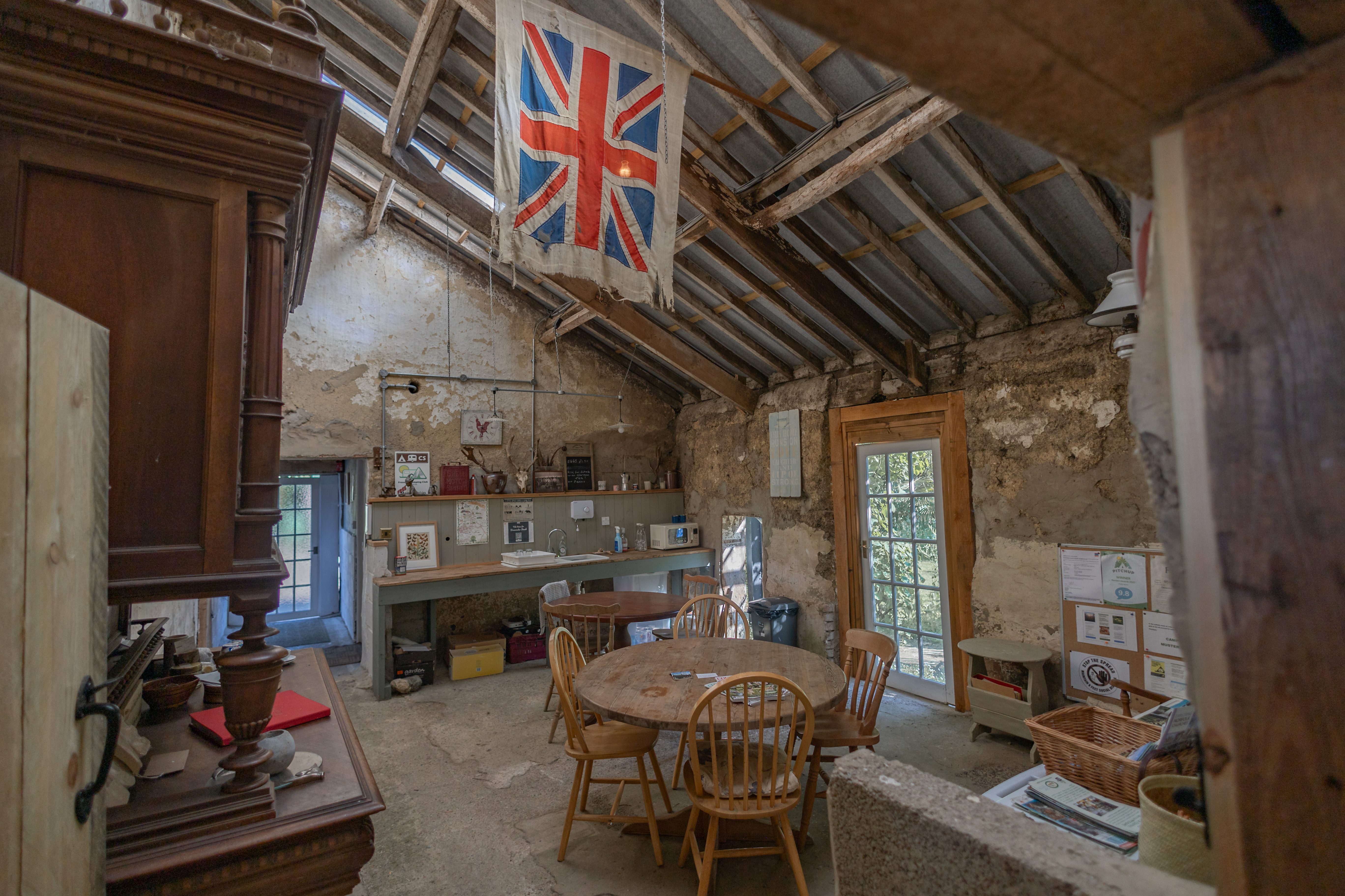 Inside the barn, you’ll find a dining table and chairs, offering a welcoming space to eat, chat, or relax. Whether you’re gathering for a meal or enjoying a moment of downtime, this area provides a cozy retreat from the outdoors.
